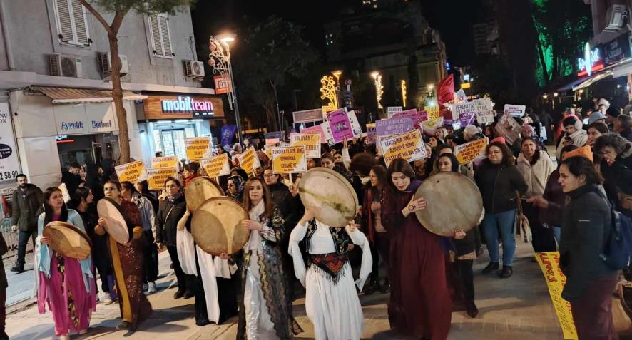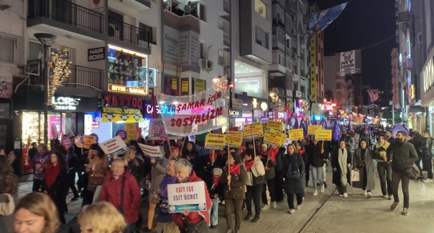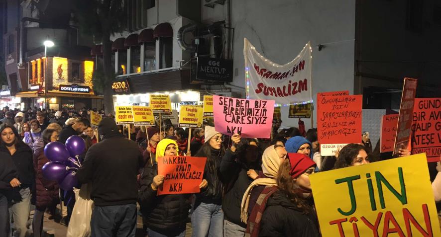 Eylemde kadına yönelik baskı ve şiddet politikalarının anlatıldığı, AKP iktidarının kadın düşmanı yaklaşımlarının ve söylemlerinin teşhir edildiği ve mücadele çağrısının yapıldığı ajitasyon konuşmaları yapıldı. Alsancak Garı’nda başlayan yürüyüş Türkan Saylan Kültür Merkezi (TKSM) önüne kadar coşkulu sloganlar eşliğinde sürdü. Yol boyunca erkek egemen düzenin dayattığı şiddet, kadın ve çocuk cinayetleri, yoksulluk, savaş ve saldırganlık üzerine konuşmalar yapıldı. İstanbul ve Ankara’da gerçekleştirilen polis saldırılarına karşı dayanışma sloganları atılırken, Diyarbakır Valiliği’nin “Jin, jiyan, azadi!” sloganını yasaklama kararı protesto edildi. Yasakların mücadeleyi engelleyemeyeceği vurgulandı.