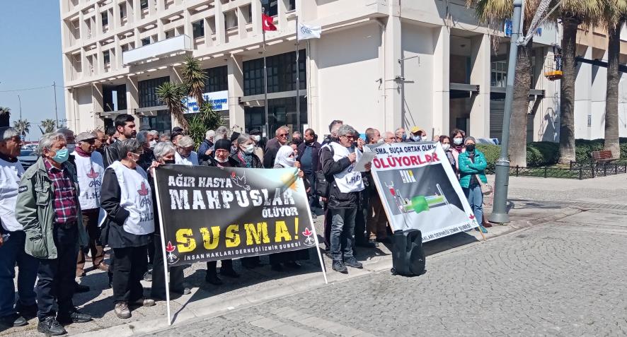 İHD İzmir Şubesi Kadın Komisyonu 8 Mart etkinlikleri kapsamında bugün Konak Eski Sümerbank önünde kadın hasta mahpusların serbest bırakılması için basın açıklaması gerçekleştirdi. Basın açıklamasını Cemile Karakaya okudu. Açıklamada İHD'ye yapılan başvurulardan ve gelen mektuplardan alıntılar yapılarak mahpusların yaşam şartlarına dikkat çekildi.
