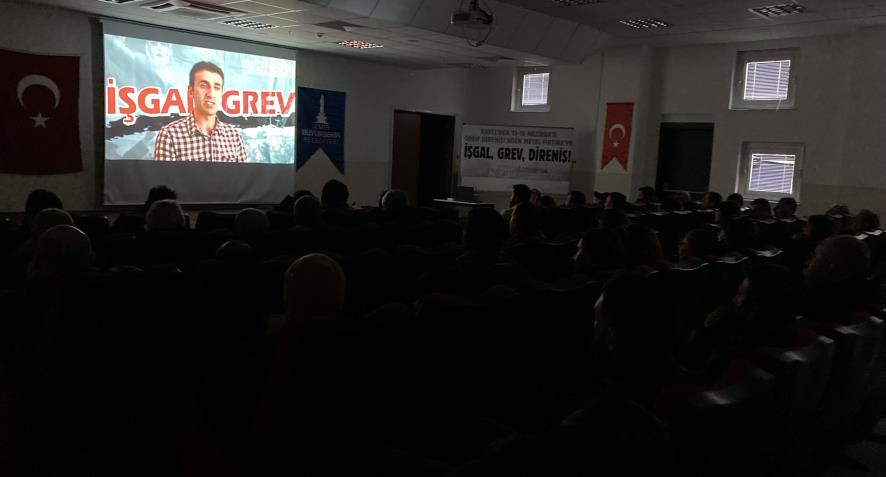 Emeğin Kurtuluşu adına yapılan konuşmanın ardından “İşgal: 60 uzun gün” belgeseli izlendi. Belgeselin sonunda ise kürsüden mücadele alanlarında buluşma, birlikte hak ve özgürlükleri geliştirme çağrısı yapılırken işçilerin coşkulu alkışlarıyla program sonlandırıldı.