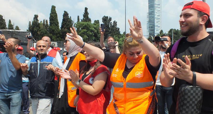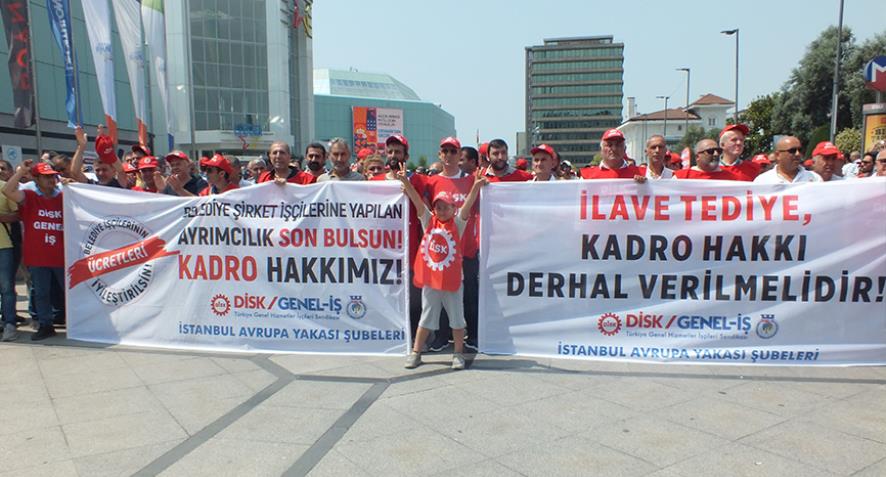 Mecidiyeköy Köprüsü altında toplanan belediye işçileri alkış, ıslık ve sloganlarla Cevahir AVM önüne yürüyüş yaptı. İstanbul Avrupa Yakası Şubeleri üyesi işçiler adına “Belediye şirket işçilerine yapılan ayrımcılık son bulsun! Kadro hakkımız!” ve “İlave tediye, kadro hakkı derhal verilmelidir!” yazılı pankartlar açıldı. Halaylarla ve sloganlarla başlayan eylemde basın açıklamasını belediye işçisi Zuhal Kaynak okudu.