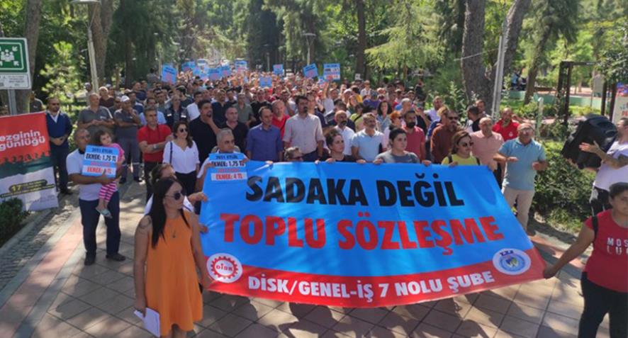 BORBEL şirketi ile Genel-İş İzmir 7 No’lu Şube arasında devam eden görüşmeler sonucunda anlaşma sağlanamadı ve belediye işçileri bugün öğlen saat 13.00’da iş bırakarak grev ilanını belediye binasına astı. Kitlesel bir şekilde tepkilerini dile getiren işçiler adına şube başkanı Özgür Genç konuşma yaptı. Genç, gelinen süreçte işveren sendikası ve belediye bürokrasisinin işçileri açlığa mahkûm ettiklerini dile getirdi ve sefalet ücretine mahkum olmayacaklarını ifade etti.