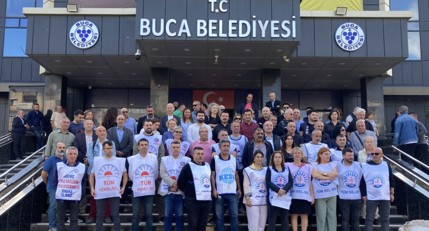 Gasp edilen hakları için 3 gündür işgal eylemini gerçekleştiren Buca Belediyesi işçileriyle dayanışma amacıyla Kamu-İş’e bağlı Tüm Yerel Sen Sendikası bugün iki saatlik iş bırakma eylemi gerçekleştirdi.