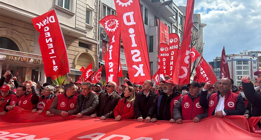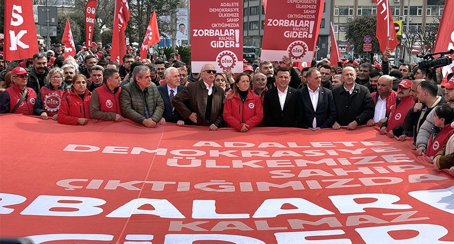 “Türkiye işçi sınıfı olarak bu büyük tehlikenin karşısında yan yana omuz omuza olmak, mücadeleyi büyütmek, bu tehlikeyi savuşturmak hepimizin tarihsel görevidir. Baskıyı, zulmü, kendi iktidarlarının güvencesi olarak görenler bilsinler ki, bu ülkenin tüm değerlerini üreten işçi sınıfı, emekçilerden, kadınlardan gençlerden yani halktan daha büyük bir güç yok.”