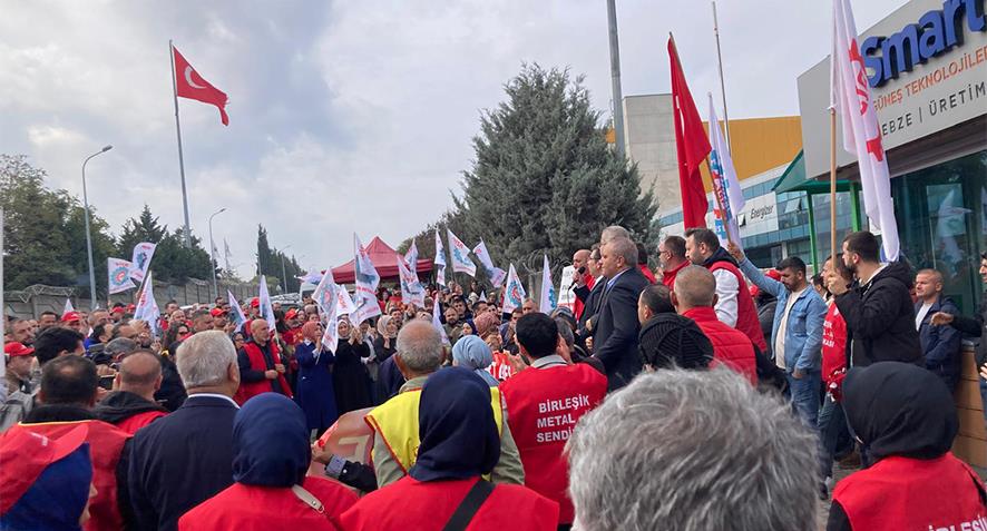 Smart Solar’da Birleşik Metal 1 No’lu Gebze Şube Başkanı Selçuk Çiftçi sınıf mücadelesinin öneminden, işçilerin karşısına çıkan iktidardan ve sarı sendikalardan bahsetti. Mücadelenin hepsine karşı verilmesi gerektiğini vurguladı.