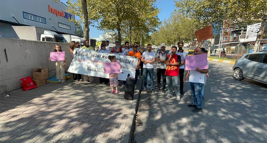 Gasp edilen haklarını almak için 19 gündür direnen HepsiJET işçileri dün (9 Ağustos) saat 16:00'da Esenyurt Kuzuyolu’nda bulunan deponun önünde açıklama yaptılar.