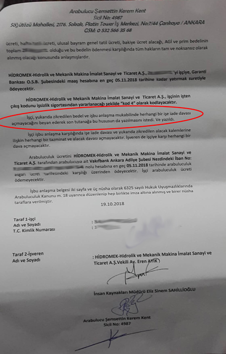 İşçilere çıkış belgeleri arasında arabulucu tutanağının da imzalatıldığını, böylece daha işten çıkmadan işçilerin her türlü hukuki girişiminin engellenmeye çalışıldığını ifade eden SİB temsilcisi, arabulucu tutanağının usulsüz bir şekilde hazırlandığını da sözlerine ekledi. Arabulucu tutanağında çıkış tarihi olarak çıkış gününden bir gün öncesinin yazıldığını, böylece arabulucu tutanağının yasal kılıfa uydurulmaya çalışıldığını söyleyen SİB temsilcisi, ayrıca kıdem tazminatı hesabına yemek ve yol paralarının dâhil edilmediğine, böylece işçilerin maddi kayba da uğratıldıklarına dikkat çekti. Arabulucu tutanağındaki en çarpıcı noktanın ise geriye dönük hak talebi ve işe iade davası açılmayacağının işçinin talebi olarak tutanağa geçirilmesi olduğunu söyleyen SİB temsilcisi, “Acaba hangi işçi böyle bir talebin tutanağa geçirilmesini ister?” diye sordu. “Görüştüğümüz işçi arkadaş odaya girmesi ile çıkması arasında maksimum 10 dakikalık bir zaman dilimi geçtiğini söylüyor. Düşünün on dakika içinde çıkış işlemleri yapılıyor, arabulucu görüşmesi yapılıyor, bir de işçi sanki işten atılan kendisi değilmiş gibi bu tutanağa işe iade davası açmayacağının yazılmasını özel olarak talep ediyor! Bizim işte bu yalana inanmamızı bekliyorlar” diyerek devam etti.