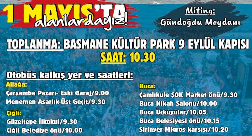Bu kapsamda Aliağa ve Menemen’de afiş ve pankartlar asılırken, Buca Kuruçeşme ve Çamlıkule mahallelerinde sokaklar dolaşılıp, emekçilere bildiriler ulaştırıldı ve otobüs kalkış saatlerinin duyurusu yapıldı. Ege Üniversite’sinde ise DGB’nin 1 Mayıs stickerlarının yanı sıra Geleceğin Sesi’nin 1 Mayıs sayısı öğrencilere ulaştırılarak 1 Mayıs çağrısı sürdürülüyor.
