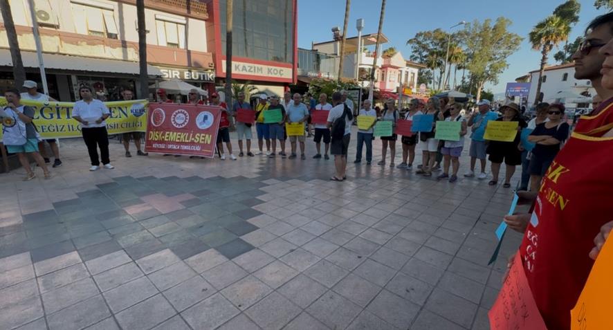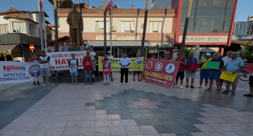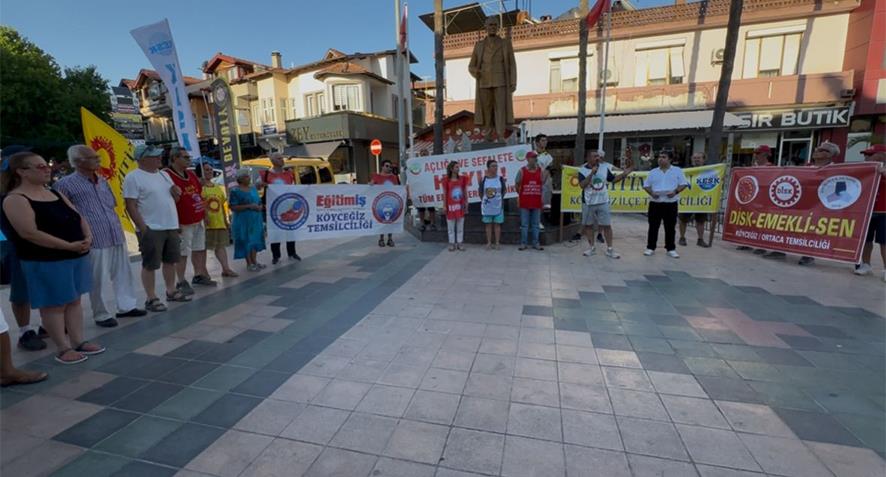 Köyceğiz’de Disk Emekli Sen, Eğitim Sen, Eğitim İş, Tüm Emeklilerin Sendikası bugün saat 19:00'da Köyceğiz Cumhuriyet Meydanı’nda ortak bir basın açıklaması gerçekleştirdi. Ortak basın metni okunmadan önce kurum temsilcileri kısa birer konuşma yaptı. Daha sonra dört emek örgütü adına ortak basın metnini Disk Emekli-Sen Temsilcisi Aydın Ağlamaz okudu.