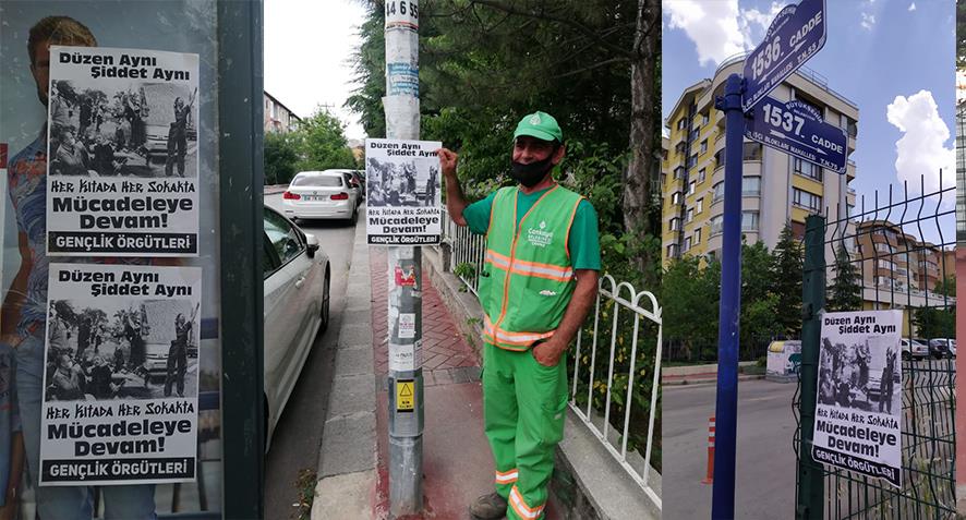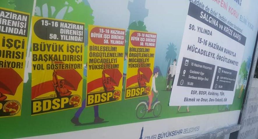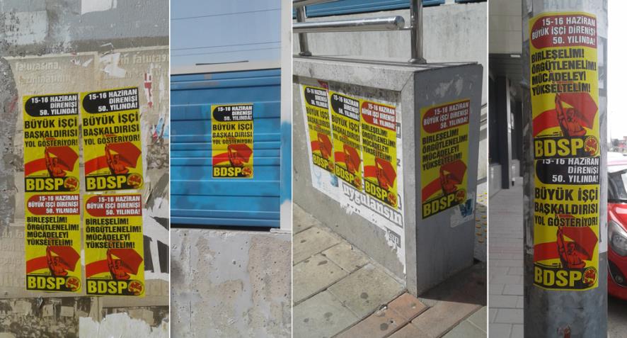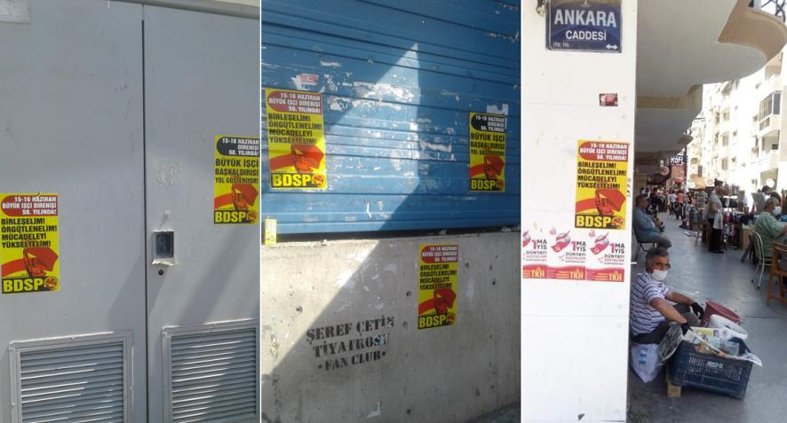 İzmir’de BDSP stickerları Çiğli, Egekent girişi, Küçük Çiğli, Balarcık, Aliağa’da işçi servislerinin geçtiği duraklarda ve emekçilerin yoğun olarak kullandığı güzergahlara, emekçi mahallesinde yapıldı. Çiğli merkezde 9 Haziran günü sticker yaparken bekçilerin engelleme girişimiyle karşılaşıldı. Stickerları sökülmeyeceğini vurgulayan sınıf devrimcilerine karşılık bekçiler sivil polise ihbarda bulundu ve 179 TL para cezası kesildi. Bekçilerle yaşanan tartışma sırasında Çiğli Belediyesi şantiye temsilcileri ve belediye işçileri sınıf devrimcilerinin yanına gelerek yalnız bırakmadılar, sivil polisler ceza kesinceye kadar da beklediler. Bir saatlik bekçi ve polis oyalamasından sonra sınıf devrimcileri faaliyetlerine devam etti.