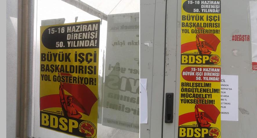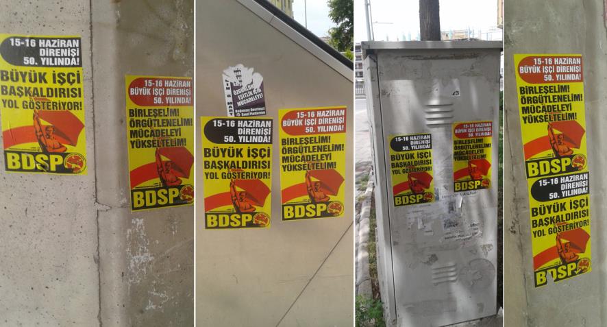 Tekirdağ Çorlu’da, BDSP’nin “15-16 Haziran direnişi 50. Yılında! Büyük işçi başkaldırısı yol gösteriyor! Birleşelim, örgütlenelim, mücadeleyi yükseltelim!” şiarlı stickerı işçi servis güzergâhlarına ve merkezi noktalara yapıldı.