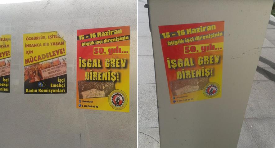 Devrimci Tekstil İşçileri Sendikası’nın (DEV TEKSTİL) “ 15-16 Haziran büyük işçi direnişi 50. yılı… İşgal, grev, direniş” şiarlı stickerı da aynı noktalarda kullanıldı.