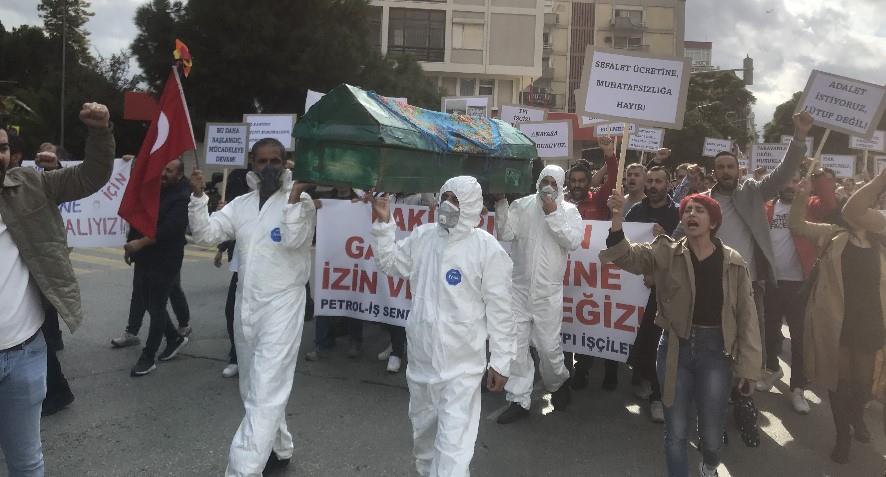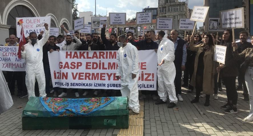 Petrol-İş üyesi TPİ işçileri grevlerinin 162’nci gününde eylem gerçekleştirdi. Türk-İş İzmir Temsilciliği önünde toplanan işçilerin İzmir Valiliği önüne yapmak istediği yürüyüş polis tarafından engellendi. Bunun üzerine Alsancak Garı’na yürüyen işçiler burada açıklama yaptılar. Coşkulu sloganlar ve tabutla yapılan yürüyüşte sık sık “Bakanlık uyuma işçilere sahip çık!”, “TPİ işçisi direnişin simgesi!”, “Kurtuluş yok tek başına ya hep beraber ya hiçbirimiz!”, “TPİ işçisi haklarının bekçisi!” sloganları atıldı.