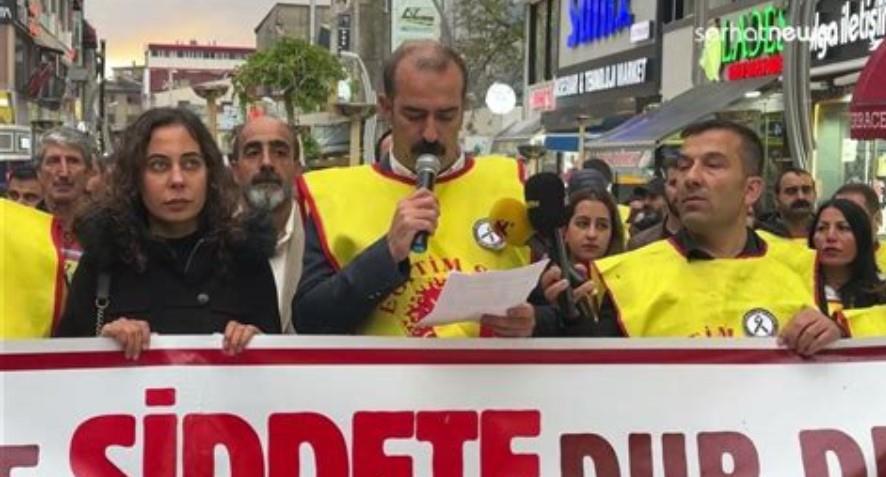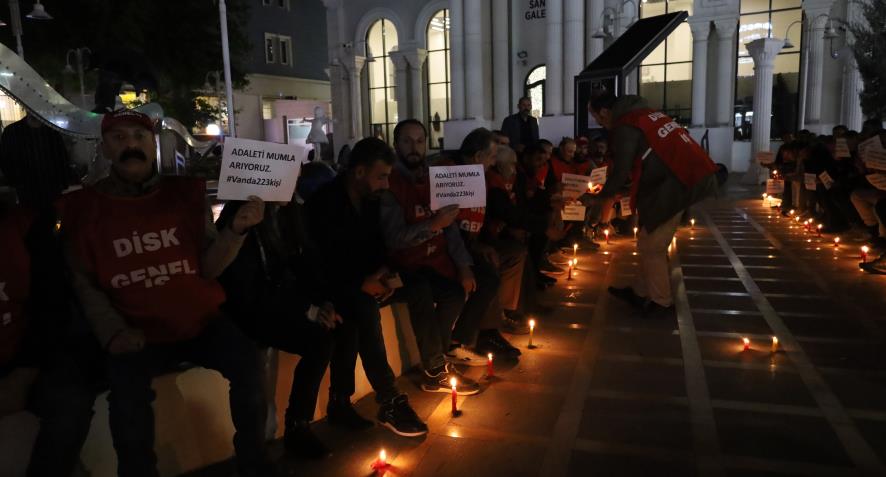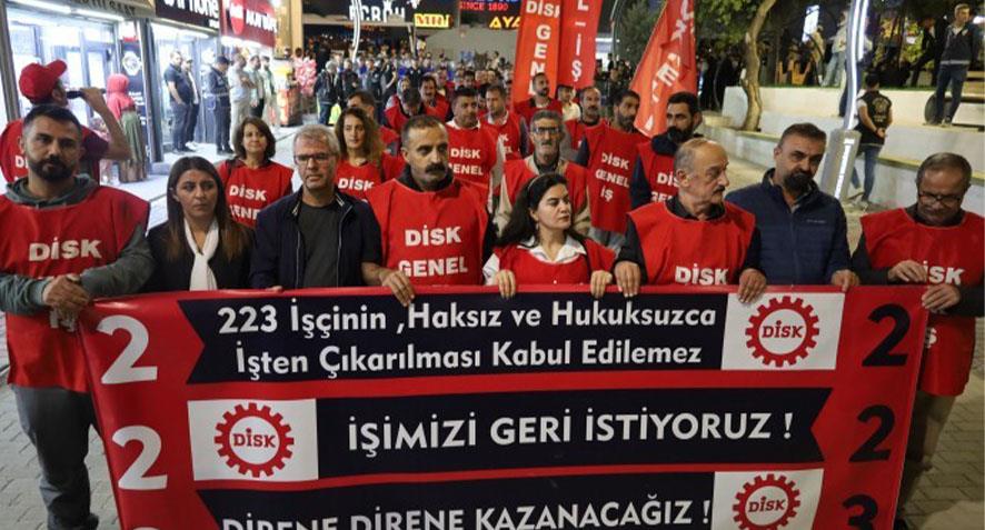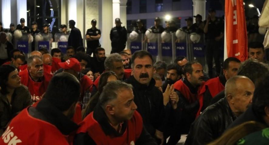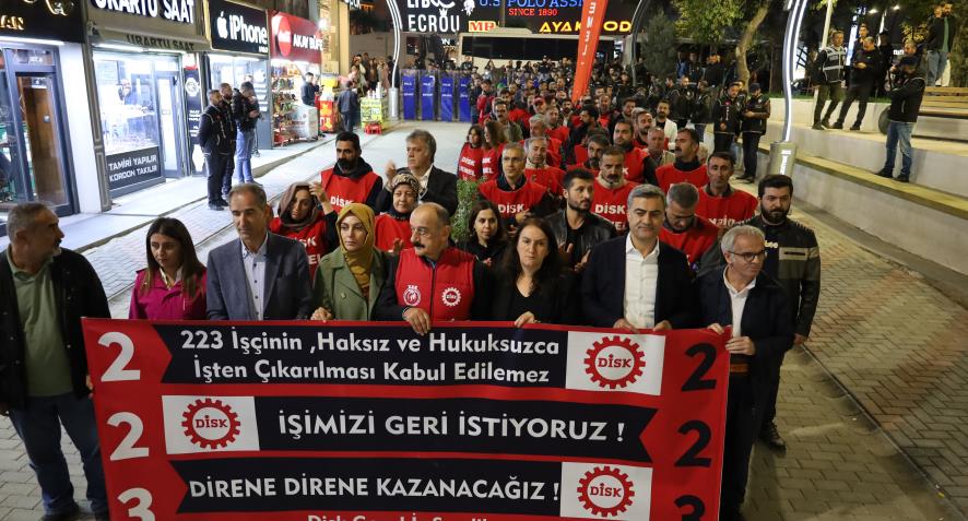 DİSK Genel-İş Van Şubesi’ne üye olan işçilerin direnişi sürüyor. Sanat Sokağı'nda bir araya gelen işçiler, Maraş Caddesi’nden sendika önüne kadar yürüyüş yaptı. Eylemde, “223 işçinin haksız ve hukuksuzca işten çıkarılması kabul edilemez. İşimizi geri istiyoruz. Direne direne kazanacağız” yazılı pankart taşınırken sık sık, “Hırsız kayyım Van’dan defol”, “Berxwedam jiyan e kayyım talan e” ve “Hak, hukuk, adalet” sloganları atıldı.